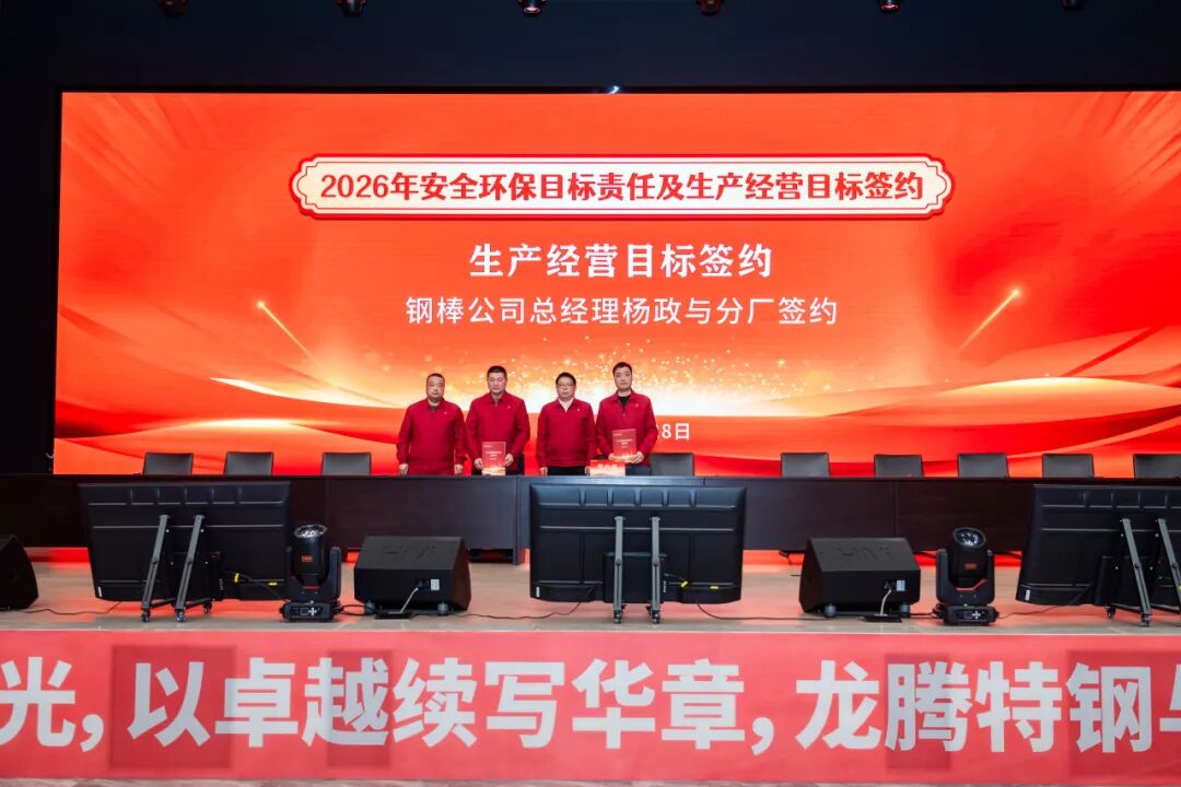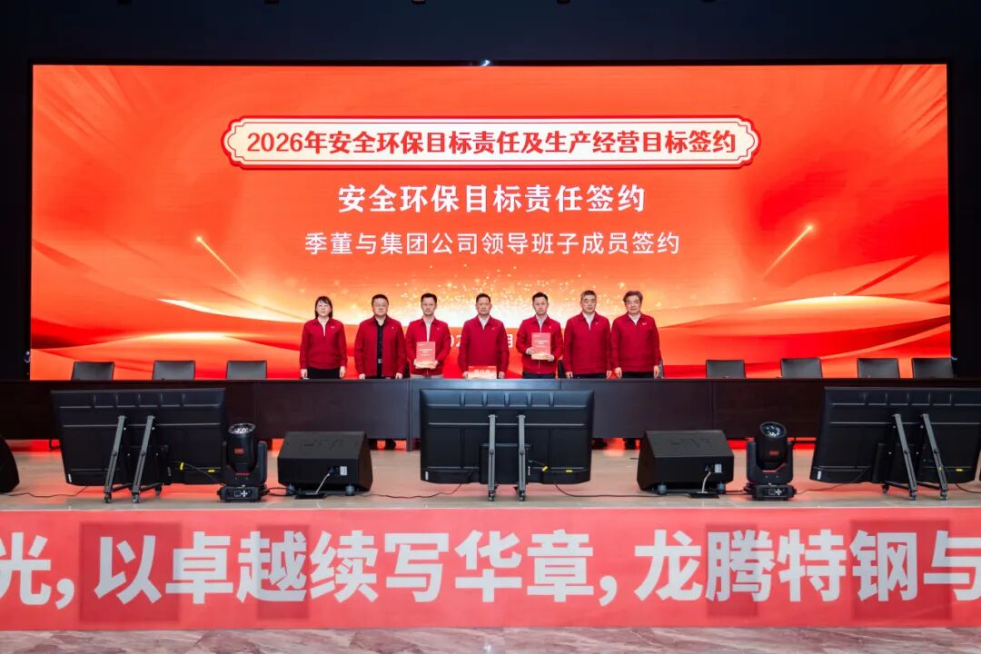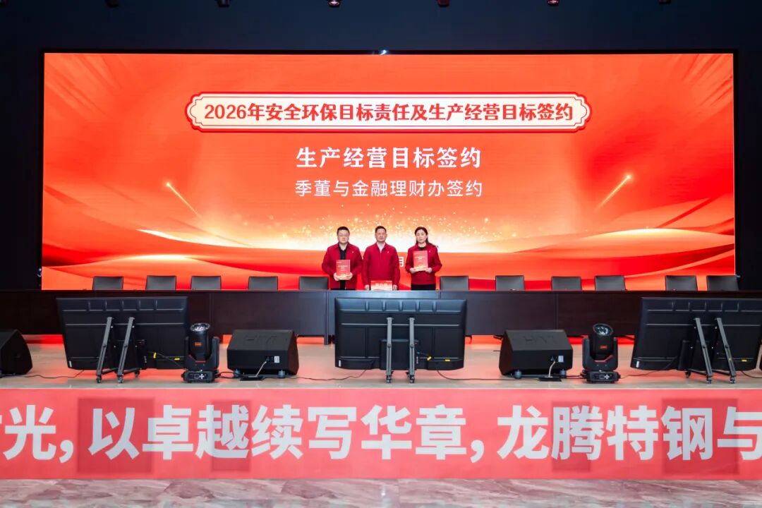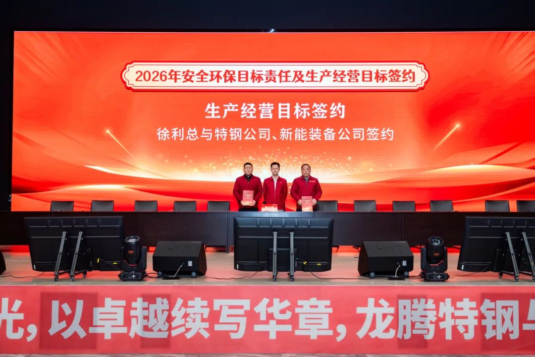 2026年1月28日,江苏龙腾特钢集团隆重召开2025年工作总结表彰大会暨2026年安全环保、生产经营目标签约会议。大会全面总结了公司2025年度取得的各项成绩,表彰了工作中涌现出的各类先进,并全面部署了2026年度各项目标任务。
