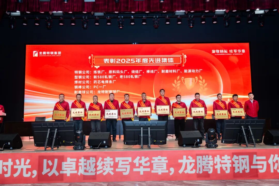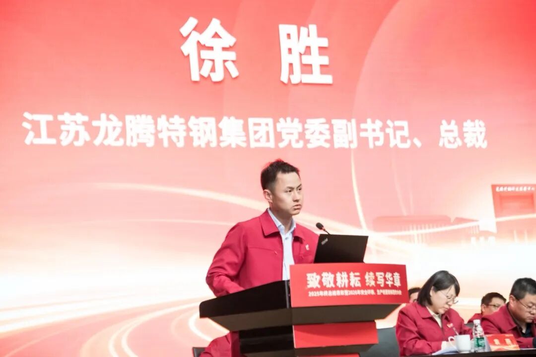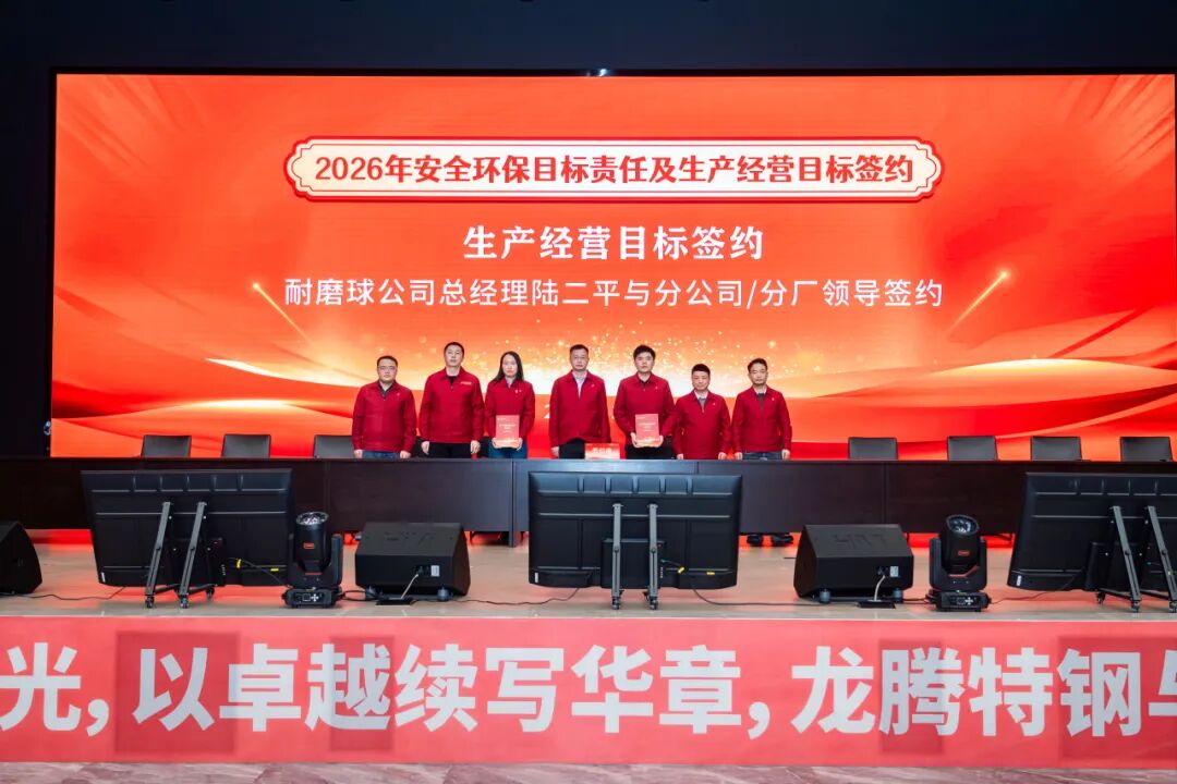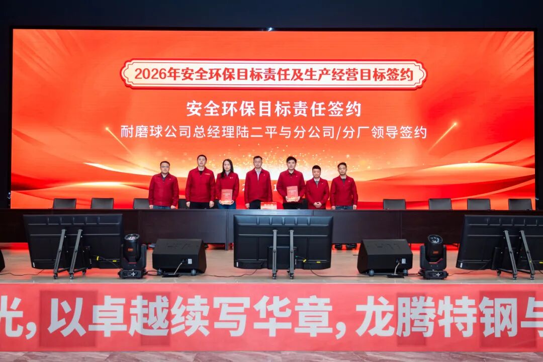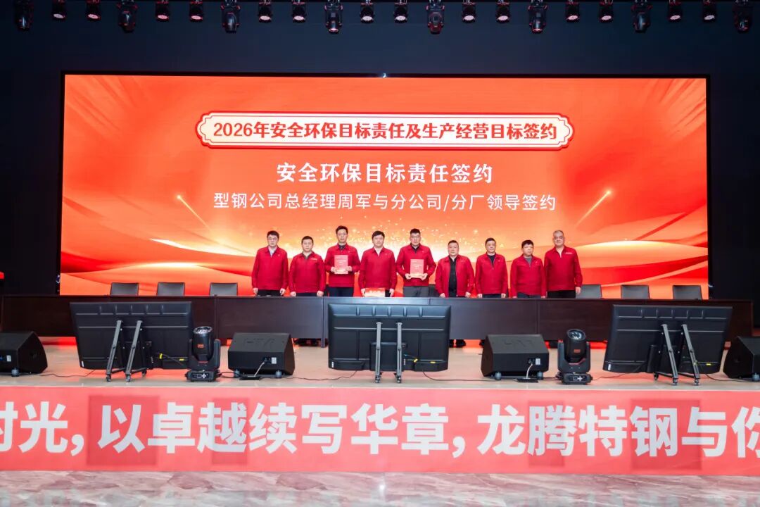 2026年1月28日,江苏龙腾特钢集团隆重召开2025年工作总结表彰大会暨2026年安全环保、生产经营目标签约会议。大会全面总结了公司2025年度取得的各项成绩,表彰了工作中涌现出的各类先进,并全面部署了2026年度各项目标任务。